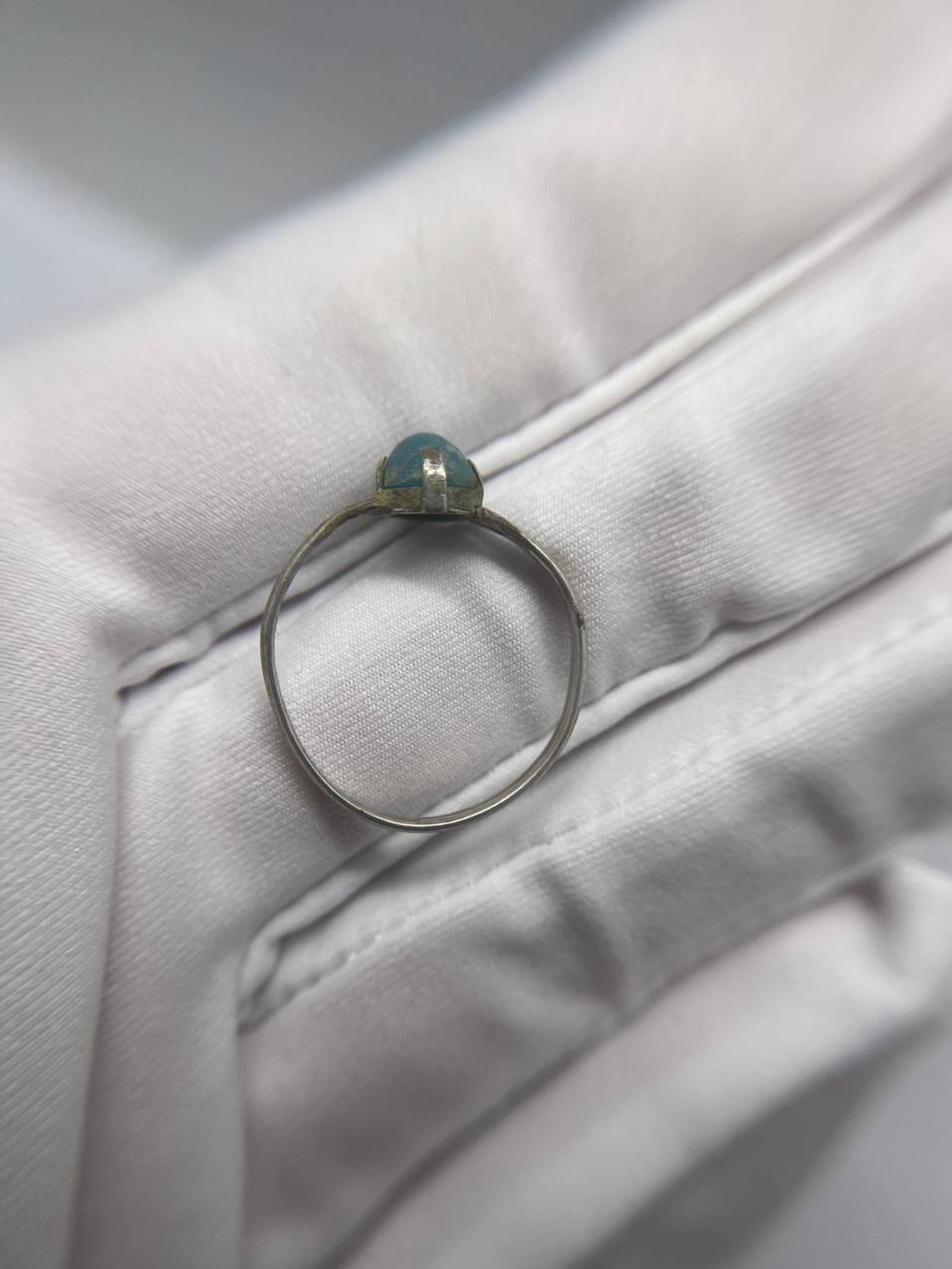 Un elegante anello in argento con pietra blu grezza montata a griffe, caratterizzato da un’estetica semplice. Il gambo è sottile, leggermente irregolare e mostra una patina naturale. Nel complesso, l’anello appartiene con buona probabilità al periodo tra XIX e XX secolo e di lavorazione artigianale.